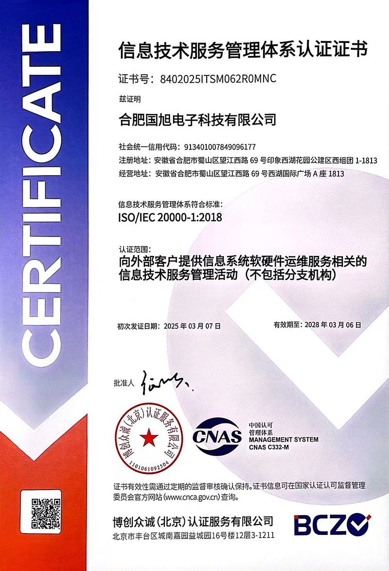 合肥國(guó)旭電子科技有限公司創(chuàng)立于2006年,總注冊(cè)資本2008萬(wàn)。公司總部地址位于安徽IT主流商圈核心,合肥市蜀山區(qū)望江西路與肥西路交口西湖國(guó)際廣場(chǎng)。 公司是專(zhuān)業(yè)從事智能防雷檢測(cè)系統(tǒng)、智能化工程設(shè)計(jì)與施工工程、防雷設(shè)計(jì)施工工程、數(shù)據(jù)中心機(jī)房、消防工程、網(wǎng)絡(luò)監(jiān)控安全技術(shù)防范工程、及智能變電站安全預(yù)警系統(tǒng)。